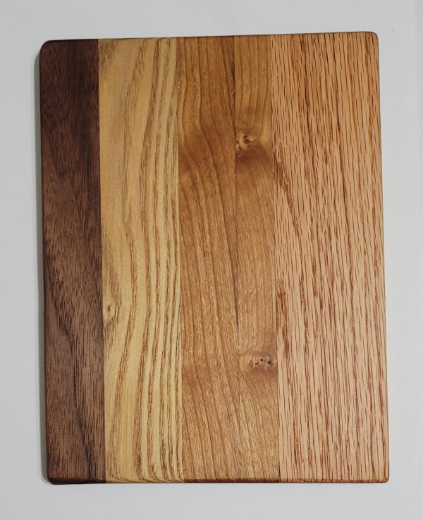 A traditional wide strip cutting board where the grain flows from one hardwood to the next. The woods are walnut, cherry, oak, and maybe red oak.