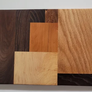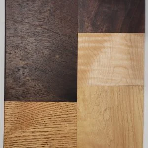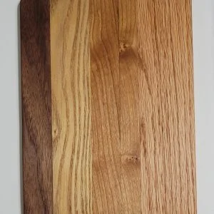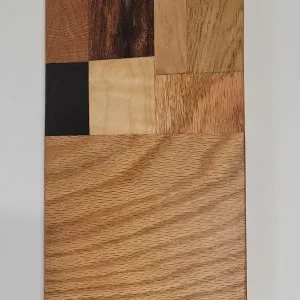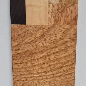 All of the woods I make boards from are hardwoods, both domestic and imported. Unless they are labeled, or easily identified, positive, specific, identification, can be a guess. Most of my wood has been donated. My sister Tammy had construction worker connections, who gave her scrap lumber for me. A couple of my high school classmates gave me wood. One of the guys lives in Texas and gave me some mesquite. Some of the boards have mesquite in them. The dimensions of the boards vary, depending on the designs, and what stock I have on hand. Sometimes, I’ll create a series of boards that all share an element. My first series, the Chrissy series, all have end grain elements, cathedral arches, triangle arches, etc.